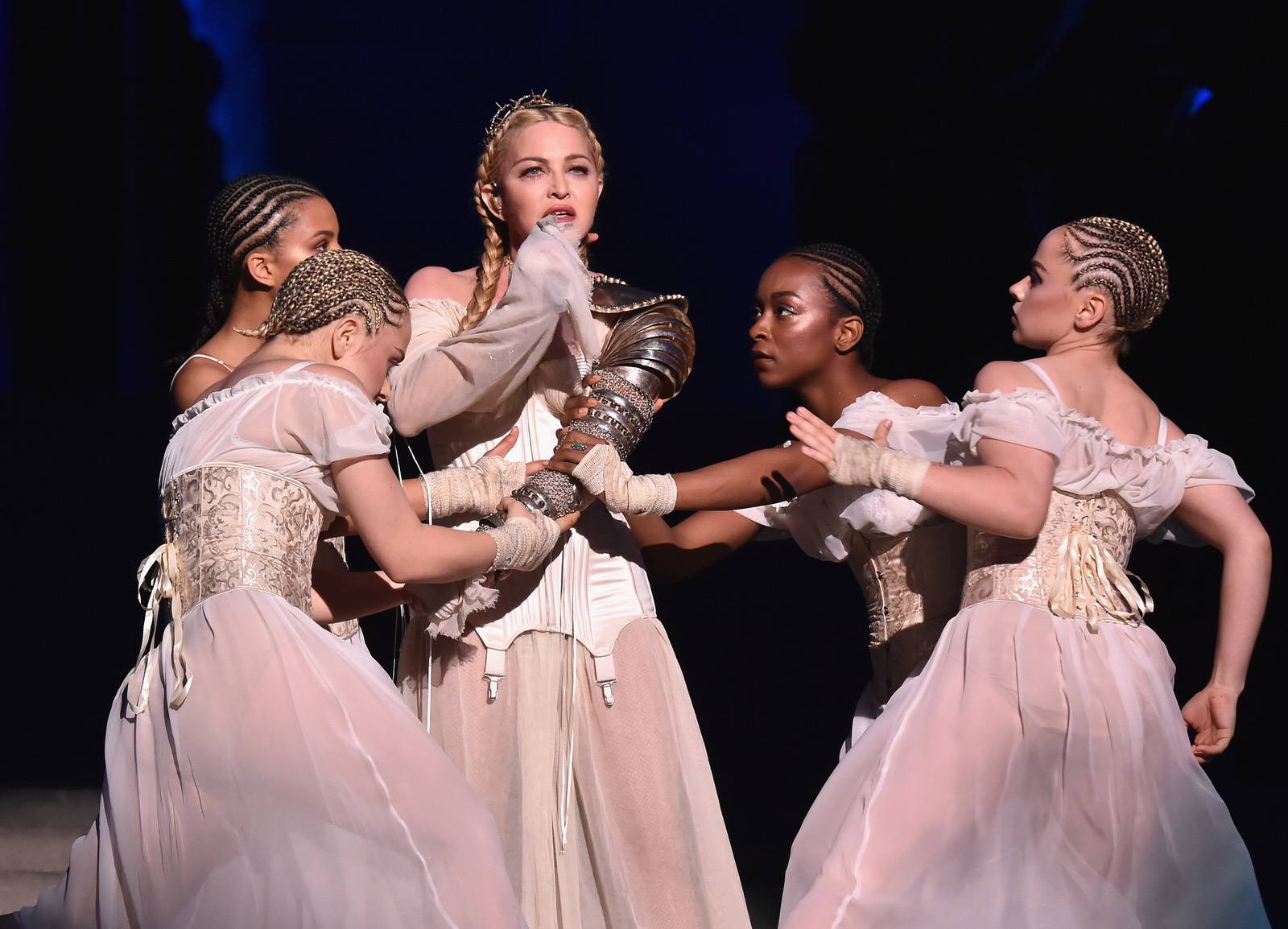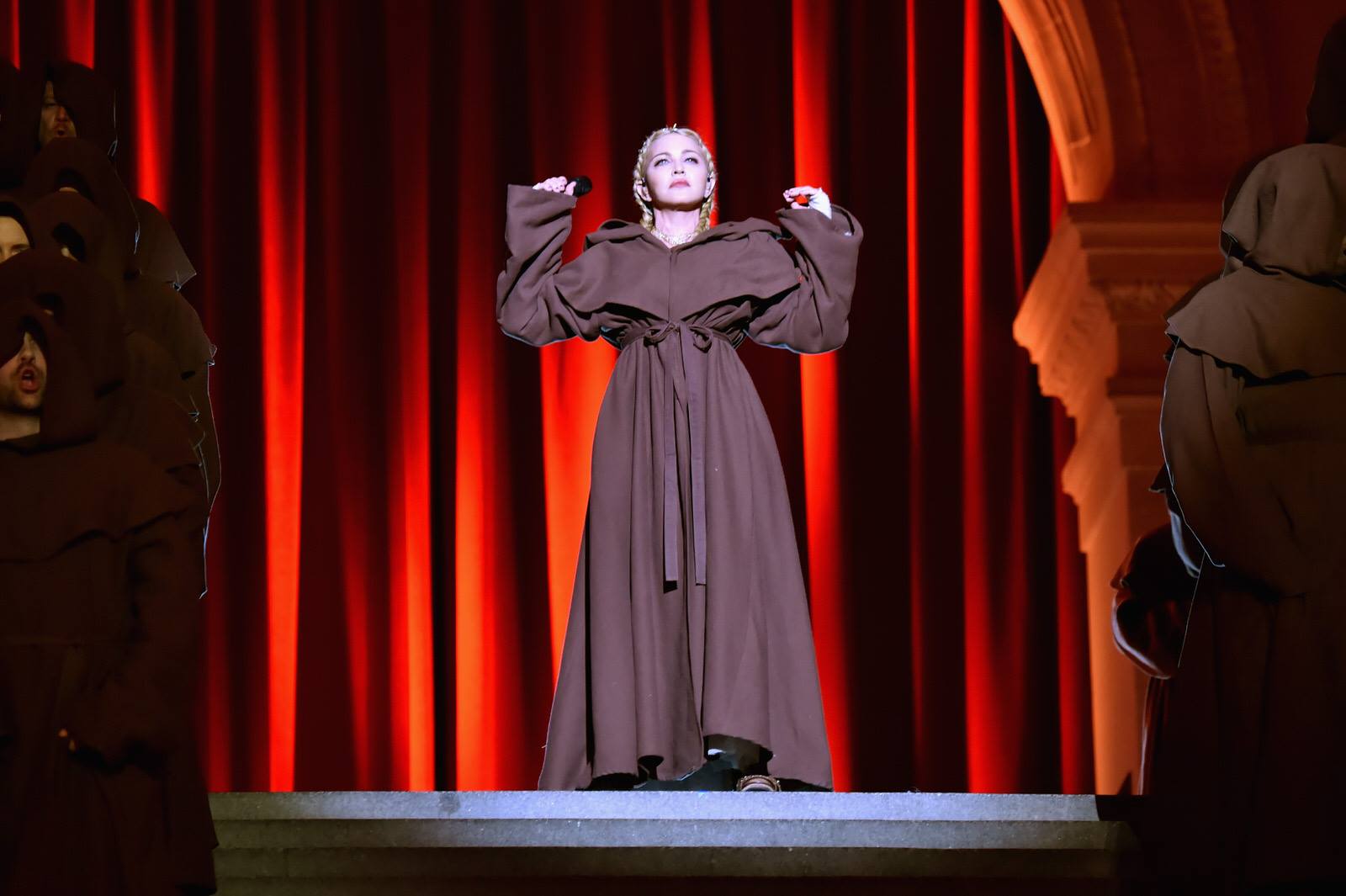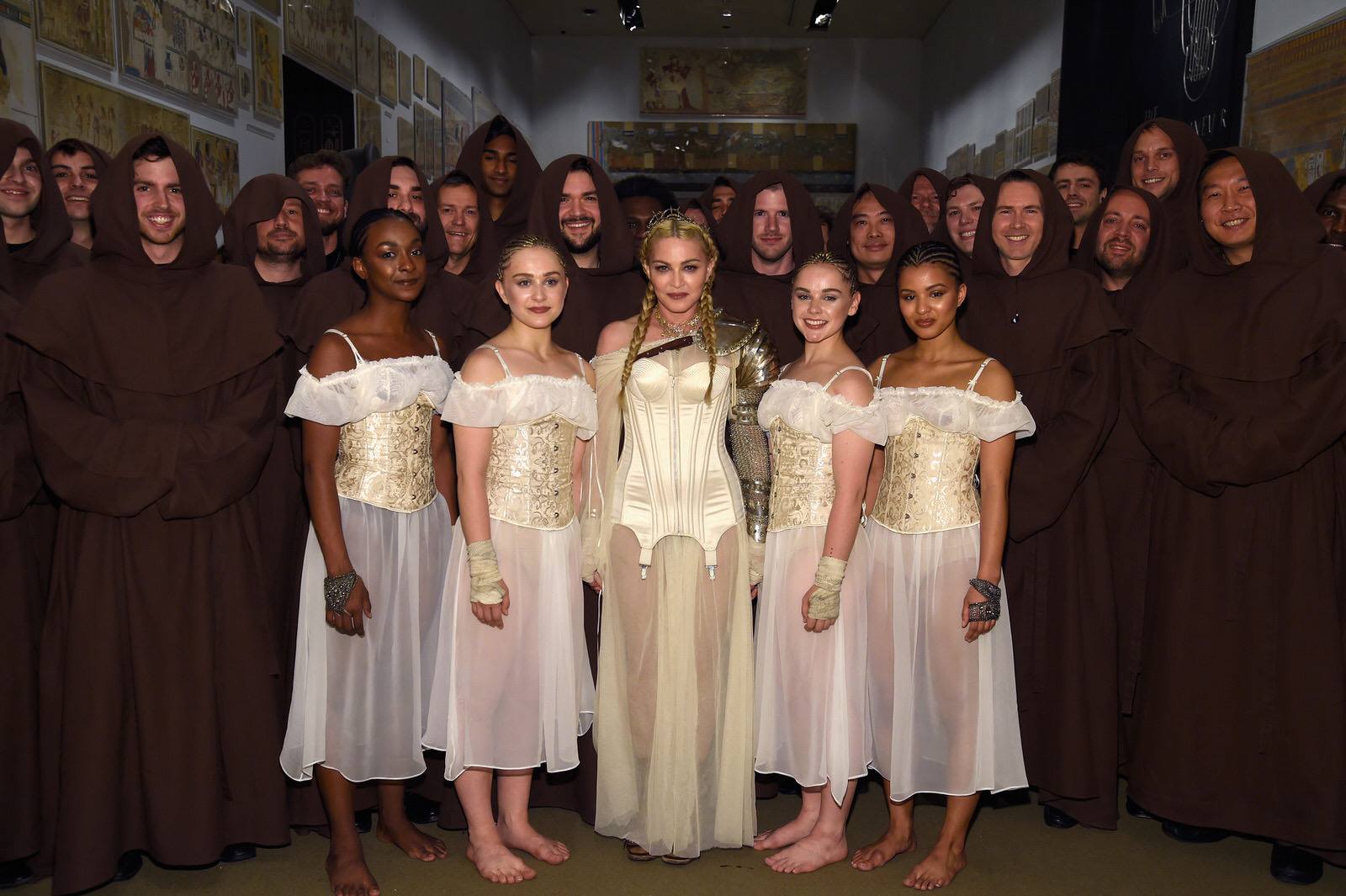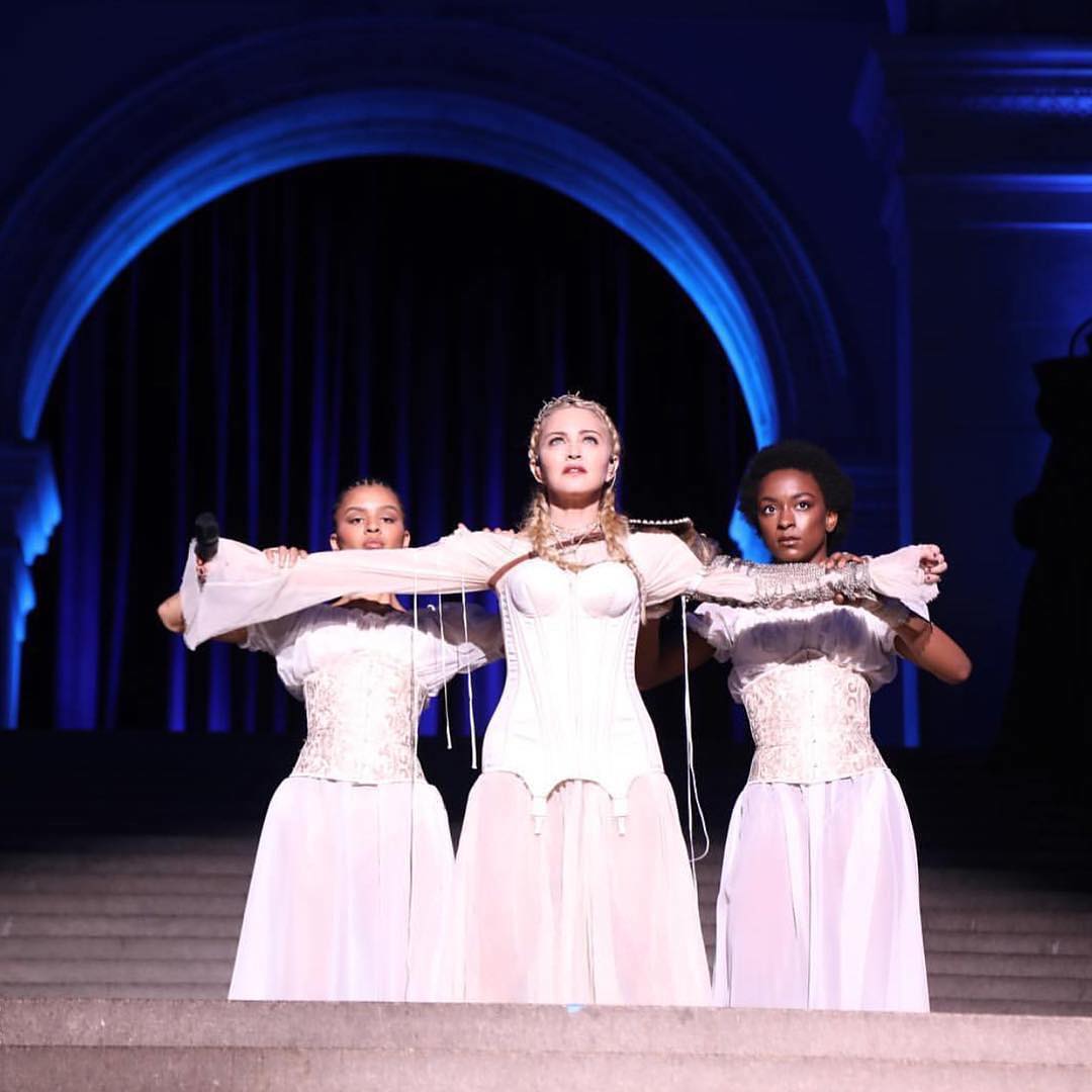 Cette année, en plus de défiler aux côtés de Jean-Paul Gaultier qui lui a confectionné ses tenues, la Reine de la pop a réservé une surprise live à tous les participants et bien sûr à ses fans ! Après le dîner, pour clôturer cette grande soirée, Madonna a interprété (devant l’assemblée se tenant dans le grand hall) 3 titres avec tenues, chorégraphie et coeurs :