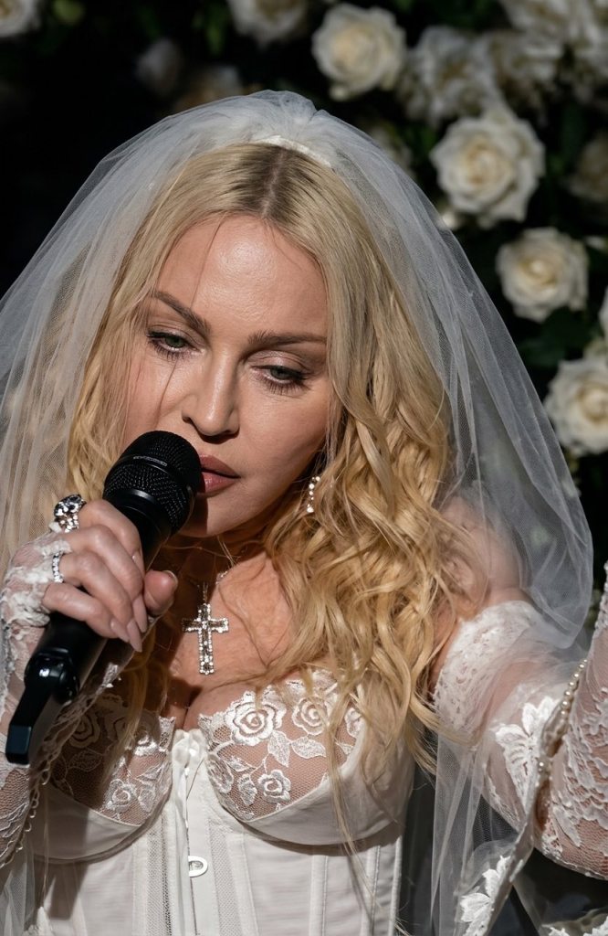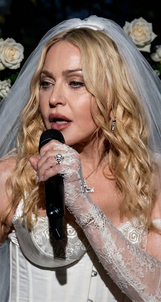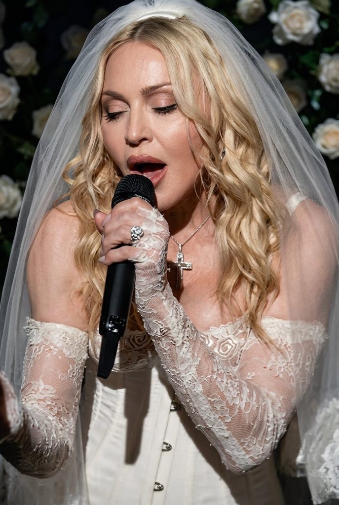 Magnifique prestation vocale d’une Madonna heureuse et rayonnante dans son corset blanc et son voile de mariée à la « Like a Virgin », titre qui aurait également été interprété lors de cette prestation.